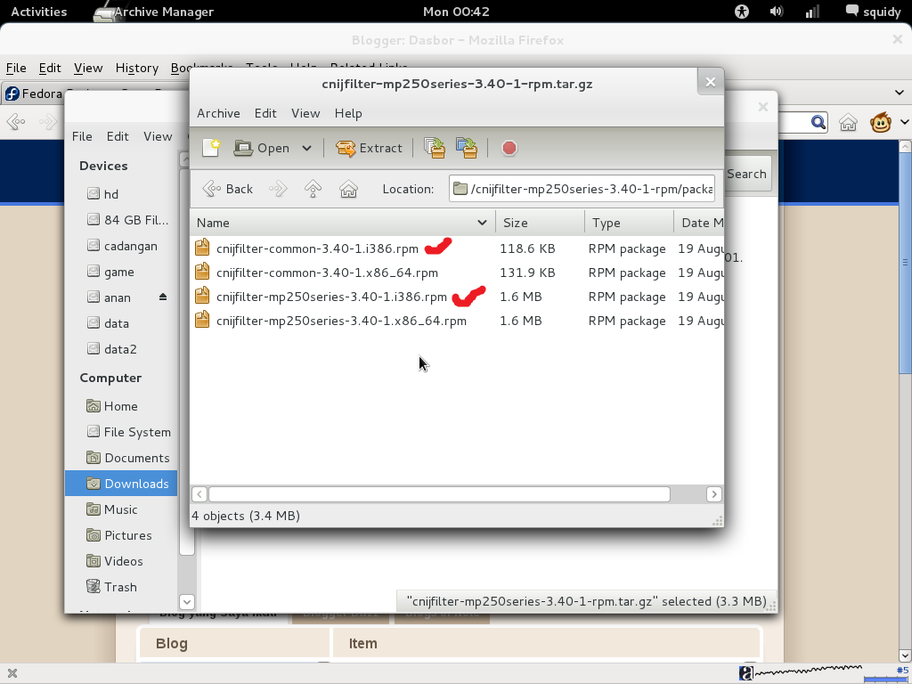 - Download driver printer dan driver scanner di atas, klik dua kali file driver printer(cnijfilter-mp250series-3.40-1-rpm.tar)