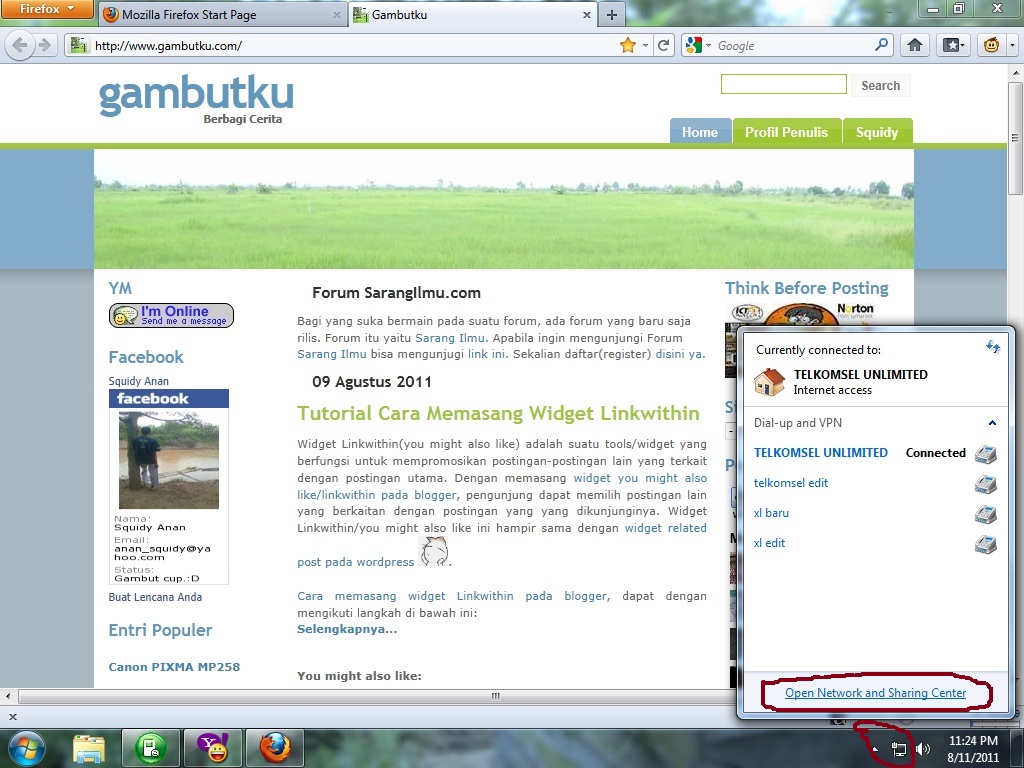 - Pilih Open Network and Sharing Center pada pojok kanan bawah layar